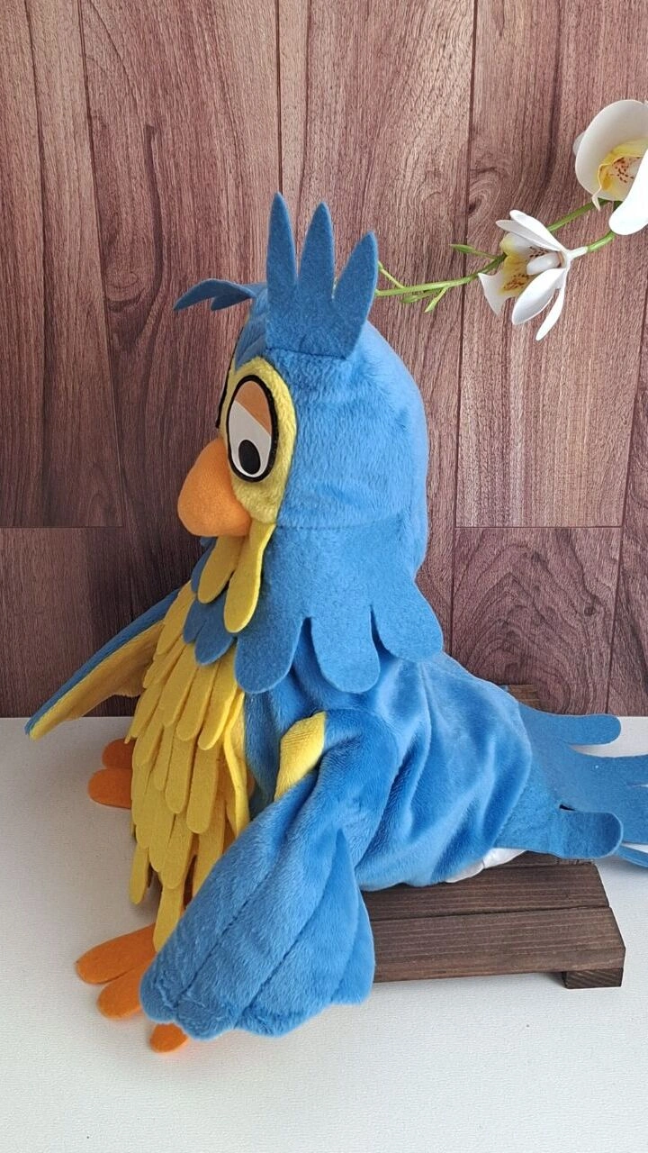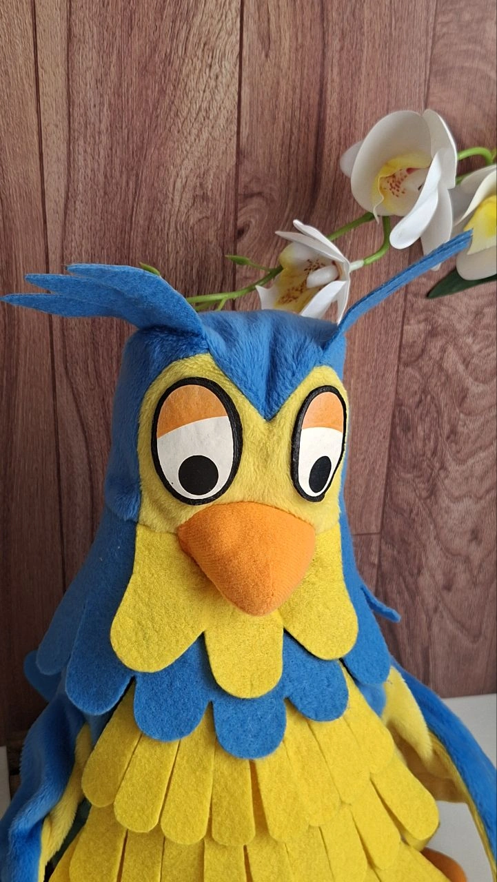 این خروس بامزه با ترکیب رنگ شادِ آبی و زرد، حس شادی و سرزندگی را بهخوبی منتقل میکند. طراحی لایهلایهی پرها از جنس نمد یا پارچهی نرم، به آن حالتی فانتزی و دوستداشتنی داده و چشمهای درشتش، کنجکاوی و شیطنت کودکانهای را نشان میدهد.